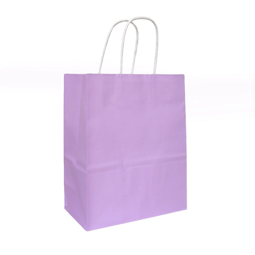 Подарочный пакет из крафтовой бумаги пастельного оттенка с белыми бумажными ручками и белой внутренней стороной.